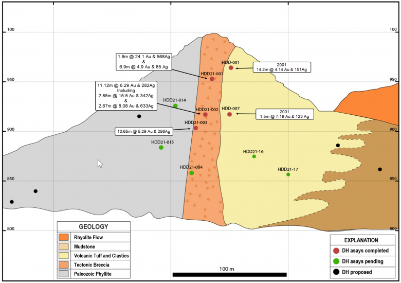 The drill results shown in Table 1 include the significant higher grade intercepts but all three drill holes HDD-21-001 to 003 cut wide zones of silicification, stockwork veining, brecciation, and anomalous and lower grade gold silver mineralization.