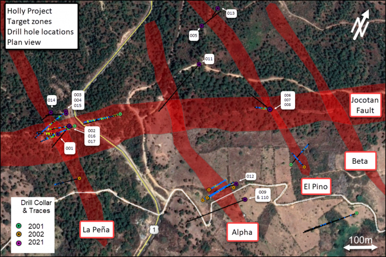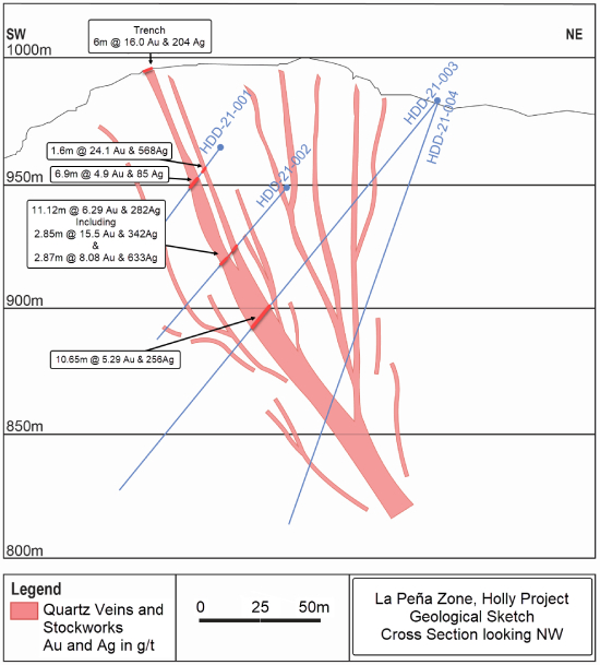 Simon Ridgway, Volcanic’s President and CEO commented: “Historic drilling at the Holly property in 2002-2003 identified several veins with very high grade gold-silver mineralization. Shallow and limited follow up drilling during the same period returned inconclusive results. In our 2021 exploration campaign, Volcanic Gold’s strong treasury allowed for a systematic approach with detailed mapping and closely spaced drilling, leading to new discoveries and a greater understanding of controls on mineralization with predictable vein intercepts on a number of the targets. Initial results from the first three holes at La Peña confirm high grade gold-silver continues to depth and we have commenced step out drilling along strike north and south and extending to depth.”